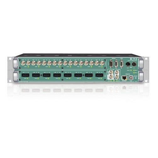 The DirectOut M.1K2 is a scalable 16-port MADI router that provides a powerful routing matrix for up to 1024 x 1024 audio channels that fills the gap between small scale routing devices and large cross bar solutions. The device features two I/O slots, ours are fitted with 1 x BNC and 1 x SC optical 8-MADI-port I/O modules.